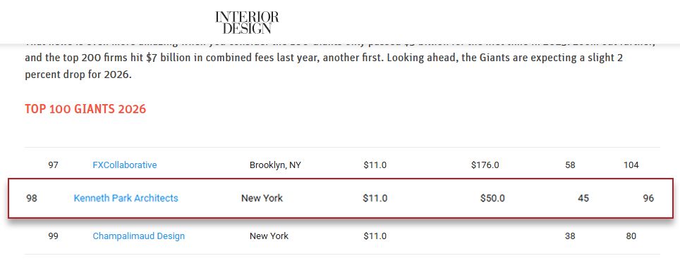 Interior Design Magazine: 100 Giants of Design Recognition | 03.16.2026 Kenneth Park Architects is honored to be ranked among Interior Design’s 2026 Top 100 Giants of Design for the second consecutive year! We thank our clients and project partners who make this recognition possible.