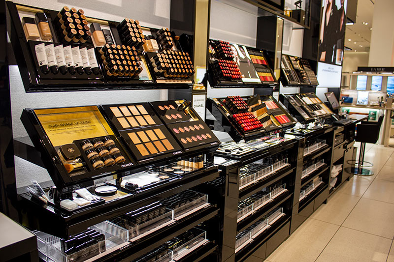 This Chanel cosmetics shop is located inside the Nordstrom near Columbus Circle in New York City. With elegant glass shelving and black angular features, this shop embodies the timeless and bold Chanel brand.
